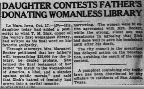 T M Zink – დააფინანსა უქალო ბიბლიოთეკა. ადვოკატს აიოვას შტატიდან, რომელიც 1930 წელს გარდაიცვალა, ისეთი უცნაური ზიზღი ჰქონდა ქალების მიმართ, რომ მთელი ცხოვრება აგროვებდა ფულს ერთი ახირებული სურვილისთვის – აეშენებინა ბიბლიოთეკა, სადაც მარტო კაცები იმუშავებდნენ და არც მის მართვაში ჩაერეოდნენ მდედრები. შესასვლელში უნდა ჰქონოდა წარწერა – “ქალების შემოსვლა აკრძალულია”. ამისთვის ზინკმა $35 000 მოაგროვა. მაგრამ მისმა ქალიშვილმა, რომელსაც სულ რაღაც $5 ერგო, გააპროტესტა და გაიმარჯვა კიდეც.