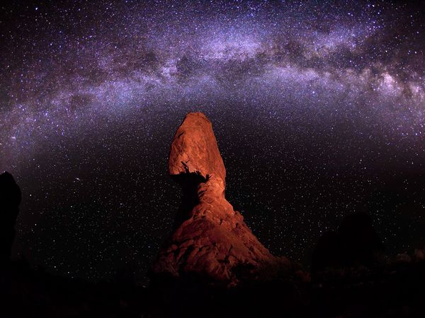 არქის ნაციონალური პარკი. ირმის ნახტომის ხედი არქის ნაციონალური პარკიდან, ბუნებრივად დაბალანსებული ქვების წყობის ფონზე.