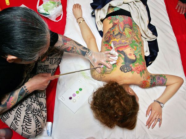 ტატუირების იაპონელი სპეციალისტი ქალის ზურგზე იაპონური ხელოვნების ნიმუშებს ხატავს.