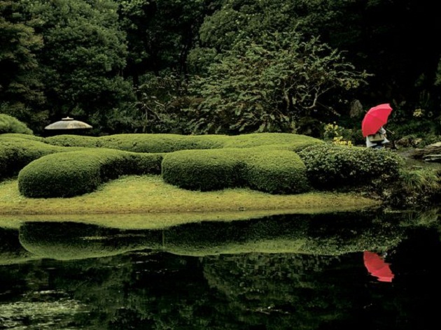 სამეფო სასახლის ბაღი იაპონიაში. ამ სიმეტრიულ ფოტოზე ყველაზე თვალშისაცემი დეტალია წითელი ქოლგა და მისი ანარეკლი წყალში. ის ახდენს დომინანტი მწვანე ფერისა და ღია ფერების ბალანსირებას.