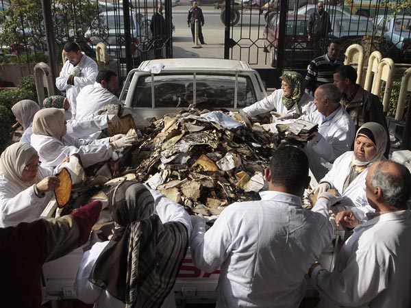 ეგვიპტელი წიგნების რესტავრატორები და ექსპერტები გარს ეხვევიან ავტომობილს, რომელიც სავსეა დაზიანებული წიგნებით. სულ ესაა ის მასალა, რისი გადარჩენაც მოხერხდა ხანძრის დროს. ეგვიპტის მთავარი ბიბლიოთეკის ხელმძღვანელმა, ზეინ აბდელ-ჰადიმ, გაერთიანებულ პრესასთან ასეთი კომენტარი გააკეთა: “ორი დღეა, არ მიძინია და გუშინ ძალიან ბევრი ვიტირე. მშვიდად ვერ ვუყურებ დამწვარ წიგნებს… მთელი ეგვიპტე მოთქვამს.”
