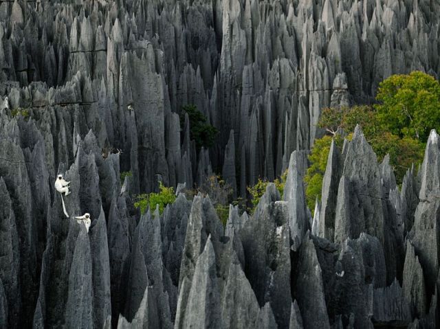 მადაგასკარული ლემურები მათი კარსტული სახლის სიახლოვეს დასავლეთ მადაგასკარში. ამ უცნაურმა კოშკებმა 1.8 მილიონი წლის წინ დაიწყო ჩამოყალიბება, როცა გაიხსნა მიწისქვეშა წყლები და შეიქმნა ფოროვანი კირქვები.