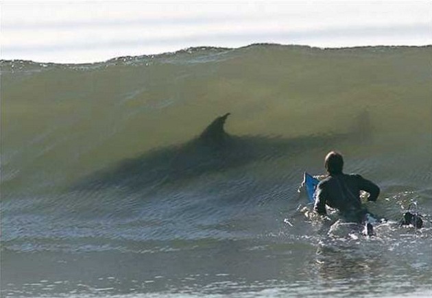 მოზრდილი დელფინების ზომა მერყეობს 2-დან 4 მეტრამდე, ხოლო წონა – 150-დან 650 კგ-მდე. ზრდასრული დიდი თეთრი ზვიგენის საშუალო სიგრძეა 4-5.2 მ, წონა კი – 680-1100 კგ. 2003 წლის აპრილში ფოტოგრაფმა კურტ ჯონსმა მალიბუს სანაპიროზე ფოტო გადაუღო სერფინგის მოყვარულს, რომლის სიახლოვესაც დელფინი მოჩანს. ის მაშინვე გავრცელდა ინტერნეტში, ოღონდ მცდარი აღწერით, რომ ეს არსება დიდი თეთრი ზვიგენი იყო. აღწერა მცდარია, თუმცა სურათი ნამდვილად გამორჩეულია – შესაფერის მომენტში სწორი კუთხით დაჭერილი კადრი.