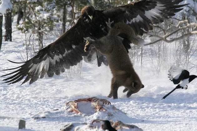 ჩრდილოეთ ნახევარსფეროში ერთ-ერთი ყველაზე ცნობილი მტაცებელი ფრინველია ოქროს არწივი. ისინი თავს ესხმიან და ხოცავენ მელიებს, შინაურ და გარეულ კატებს, მთის თხებს, ქვის თხებს, ახალგაზრდა ირმებსა და მოზრდილ შველსაც კი. ბევრ მთიან რეგიონში მათ ევროპულ ქვესახეობას იყენებენ მგლებზე ნადირობისას. ეს ფოტო გადაღებულია ფინელი ფოტოგრაფის პეკა კომის მიერ 2006 წლის თებერვალში არა მონტანაში (როგორც ფართოდ გავრცელებული აღწერა გვამცნობს), არამედ სამხრეთ ფინეთში. მელია თოვლში დაგდებულ ხორცს მიუახლოვდა და ამ დროს დააცხრა თავზე არწივი, რასაც მწვავე ცემა-ტყეპა მოჰყვა მათ შორის. საბოლოოდ არწივმა გაიმარჯვა და მელას ატაცება მოახერხა, თუმცა ფოტოს გადაღების შემდგომ ამ უკანასკნელმა თავი დაიძვრინა და გაქცევა შეძლო.
