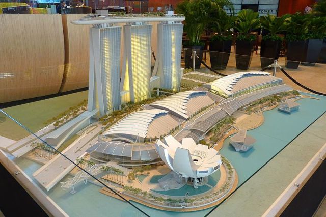 აუზი შთამბეჭდავ, გემის ფორმის ნაგებობაზე, ე.წ. SkyPark-ზე მდებარეობს, რომელიც, თავის მხრივ, სამ მაღალ კოშკზეა განლაგებული. ამის შემდეგ გასაკვირი არაა, რატომ იზიდავს სასტუმრო უამრავ ადამიანს და რატომ დაიმკვიდრა გამორჩეული ადგილი. ის ასევე ყველაზე ძვირადღირებული სასტუმროა, მისი მშენებლობა 6.3 მილიარდი აშშ დოლარი დაჯდა, მთლიანობაში კი პროექტის დასრულებამდე 8 მილიარდი დოლარი დაიხარჯა.