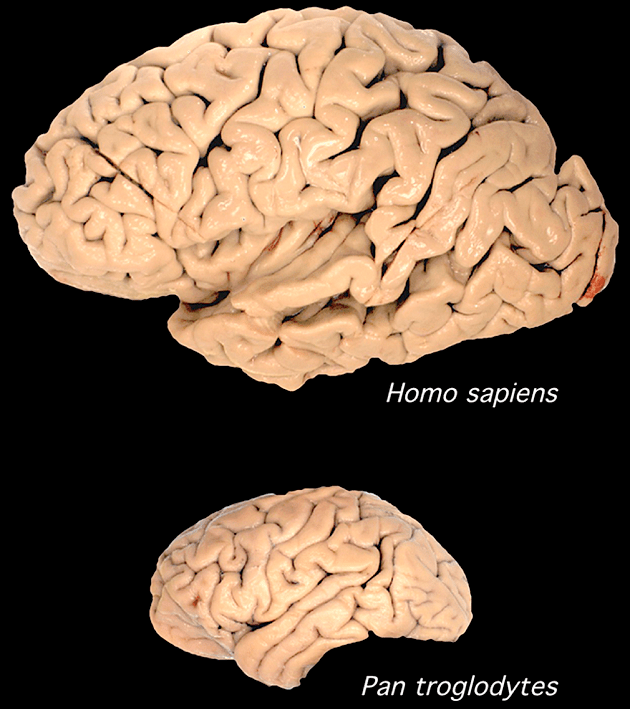 ტვინის ზომა. შიმპანზეს ტვინის საშუალო ზომა შეადგენს 370 კუბურ სმ-ს, ადამიანისა კი 1350 კუბურ სმ-ს, რაც დაახლოებით სამჯერ მეტია. თუმცა მხოლოდ ტვინის ზომა არ წარმოადგენს ინტელექტის აბსოლუტურ ინდიკატორს. ნობელის პრიზის მფლობელთა შემთხვევაში ტვინის ზომა მერყეობდა 900-დან 2000 კუბ. სმ-მდე. ინტელექტის გასაზომად უკეთესი საშუალებაა ტვინის ცალკეული მონაკვეთების სტრუქტურასა და წყობაზე დაკვირვება. ზედაპირის ფართობი ადამიანების შემთხვევაში პროპორციულად უფრო დიდია, რადგან ორგანო გაცილებით დანაოჭებულია, ვიდრე შიმპანზეების შემთხვევაში, სხვადასხვა უბნებიც უფრო კარგად არიან ერთმანეთთან დაკავშირებულნი. ეს მონაცემები და ასევე შუბლის წილის (რომელიც მონაწილეობს ცნობიერებასა და აზროვნებაში) შედარებით დიდი მოცულობა გვაძლევს ლოგიკური აზროვნებისა და შემეცნების ბედნიერებას.