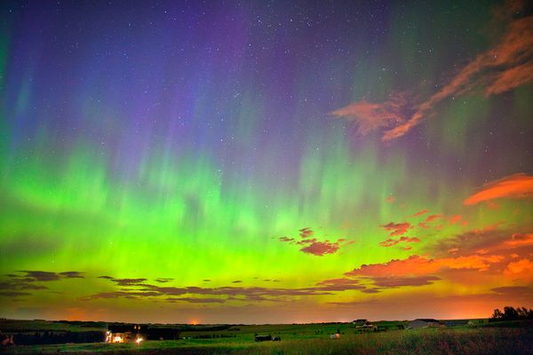 მწვანე პოლარული ნათება და ნარინჯისფრად შეფერადებული ღრუბლები კანადის ქალაქ კალგარში.