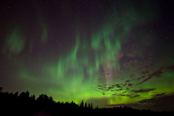 ჩრდილოეთის ციალი, რომელიც ვარსკვლავებზე დაკიდებულს ჰგავს. კანადის ქალაქი კოჩრეინი.