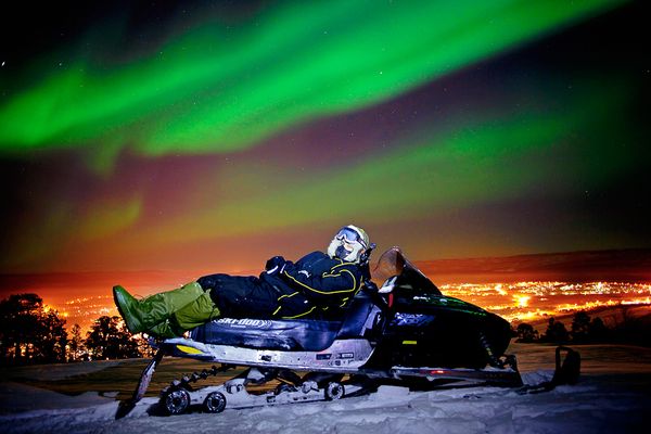 თოვლმავალზე წამოწოლილი მძღოლი ნორვეგიის სოფელ კარასიოკში.
