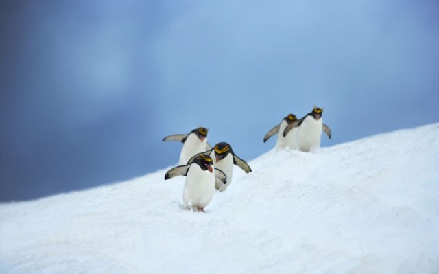 ოქროსთმიანი პინგვინები (Eudyptes chrysolophus) მყინვარზე, სამხრეთ ჯორჯია.