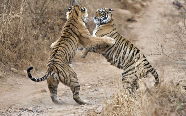 დედა-შვილი ბენგალური ვეფხვები ტერიტორიისთვის ორთაბრძოლას მართავენ, რანტამბორის ეროვნული პარკი, ინდოეთი.