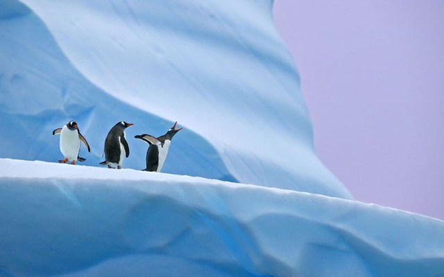 პაპუის პინგვინები (Pygoscelis papua) აისბერგზე, მიკელსენის უბე, ანტარქტიდა.