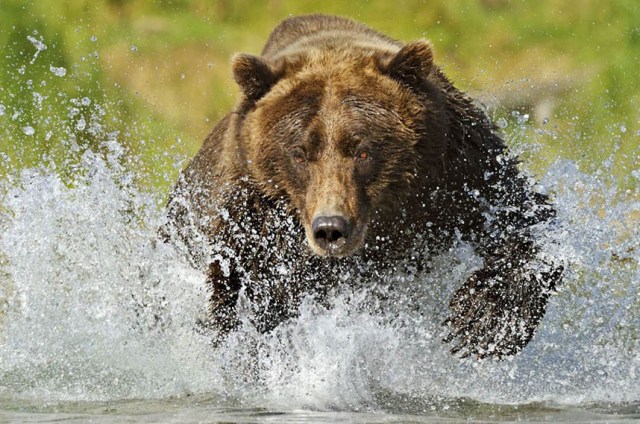 გრიზლის დათვი ორაგულზე ნადირობს კატმაის ეროვნულ პარკში, ალასკა.