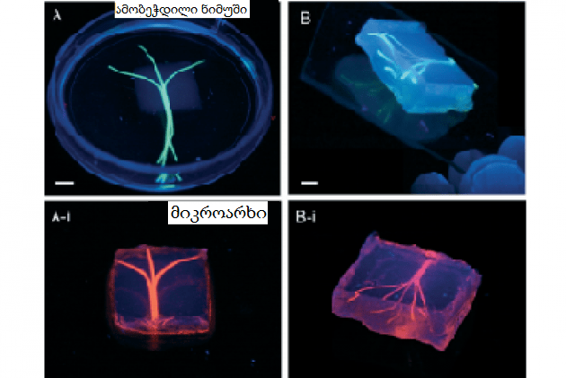 ჯგუფმა ჯერ ამობეჭდა 3D სისხლძარღვის ნიმუში, რომელიც შედგება აგაროზას ბოჭკოებისგან, შემდეგ კი დაფარეს ჟელატინის მსგავსი ნივთიერებით, რომელსაც ჰიდროგელი ეწოდება. მიღებული მასალა გააძლიერეს ფოტოკროსლინკის (მაკრომოლეკულებს შორის კოვალენტური ბმის წარმოქმნა) მეშვეობით და ამოაცალეს სისხლძარღვის ნიმუში, შედეგად დარჩა პერფუზირებადი მიკროარხები მრავალფეროვანი არქიტექტურული თავისებურებებით. ჯგუფმა შეძლო ან ფუნქციონირებადი მიკროარხების ჩანერგვა სხვადასხვა ჰიდროგელურ მასალებში და აჩვენეს, რომ ამ ქსელებს შეუძლიათ გააუმჯობესონ ქსოვილების შიგნით ნივთიერებების გადატანა და გაზარდონ მათი სიცოცხლისუნარიანობა. მაგრამ უფრო მნიშვნელოვანი ალბათ ისაა, რომ მიკროარხებში წარმატებით ფორმირდებოდა ენდოთელური უჯრედების ერთშრიანი ფენები.