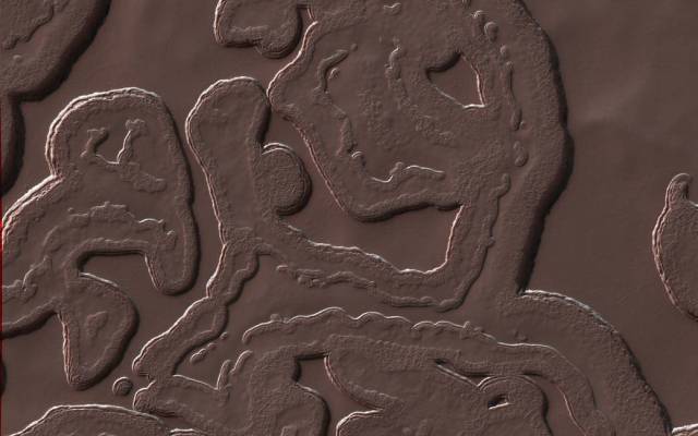 თუმცა მარსს ეგზოტიკური მხარეც აქვს, რომლის მსგავსს დედამიწაზე ვერ შეხვდებით. ამ ფოტოზე ჩანს სამხრეთ პოლუსის რეგიონი. აქაური ყინულოვანი ქუდები შედგება ნახშირორჟანგისგან (მშრალი ყინული), რომელიც ჩვენს პლანეტაზე ბუნებრივად არ ჩნდება. წრიული ფოსოები ამ მშრალი ყინულის ფენებში არსებული ხვრელებია, რომლებიც ყოველ მარსულ წელიწადს რამდენიმე მეტრით ფართოვდება.