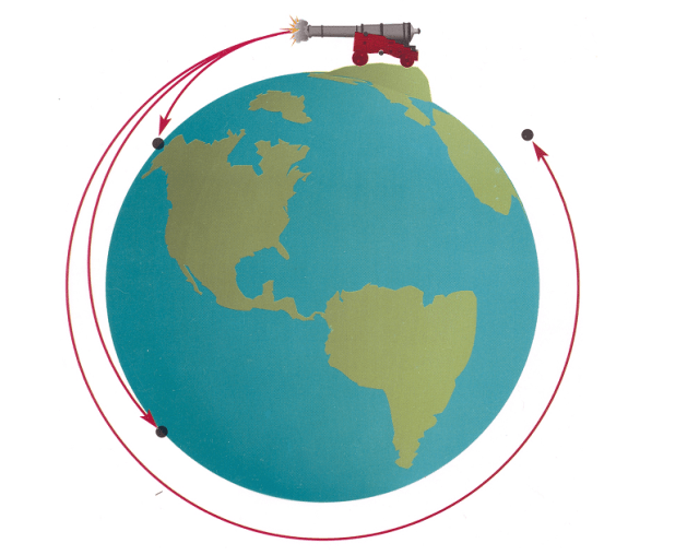 წარმოიდგინეთ, რომ გაქვთ გიგანტური ქვემეხი, რომელიც დადგით მაღალი მთის წვერზე, ისე რომ ატმოსფეროზე მაღლა დგას და ჰორიზონტალურად გაისროლეთ. შესაძლოა უპასუხისმგებლო, თუმცა ყურადსაღები ქმედებაა. თუკი გასროლა დაბალი სიჩქარით მოხდა, გრავიტაცია ჭურვს მიიზიდავს და რკალის ფორმის ტრაექტორიით დედამიწის ზედაპირზე დააგდებს. თუკი დენთს დაამატებთ, ბირთვი სწრაფად გავარდება წინ და რკალურ ტრაექტორიაზე მოგვიანებით გადავა, დაცემის ადგილიც უფრო შორს იქნება. საკმარისად სწრაფად გასროლის შემთხვევაში ჭურვის ტრაექტორია მიწას საერთოდ არ დაუკავშირდება – დედამიწას გარს შემოუვლის და უკნიდან დაგეჯახებათ.